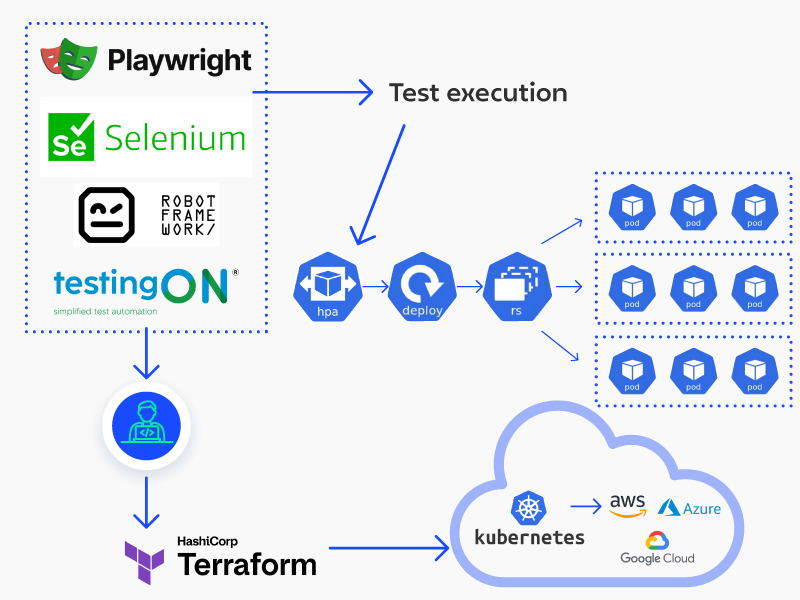4. Contamos com uma Cloud Execution Layer que executa os testes através de Runners & Workers, orquestrados por Kubernetes e Infrastructure as Code (IaC), garantindo uma escalabilidade fluida entre ambientes.