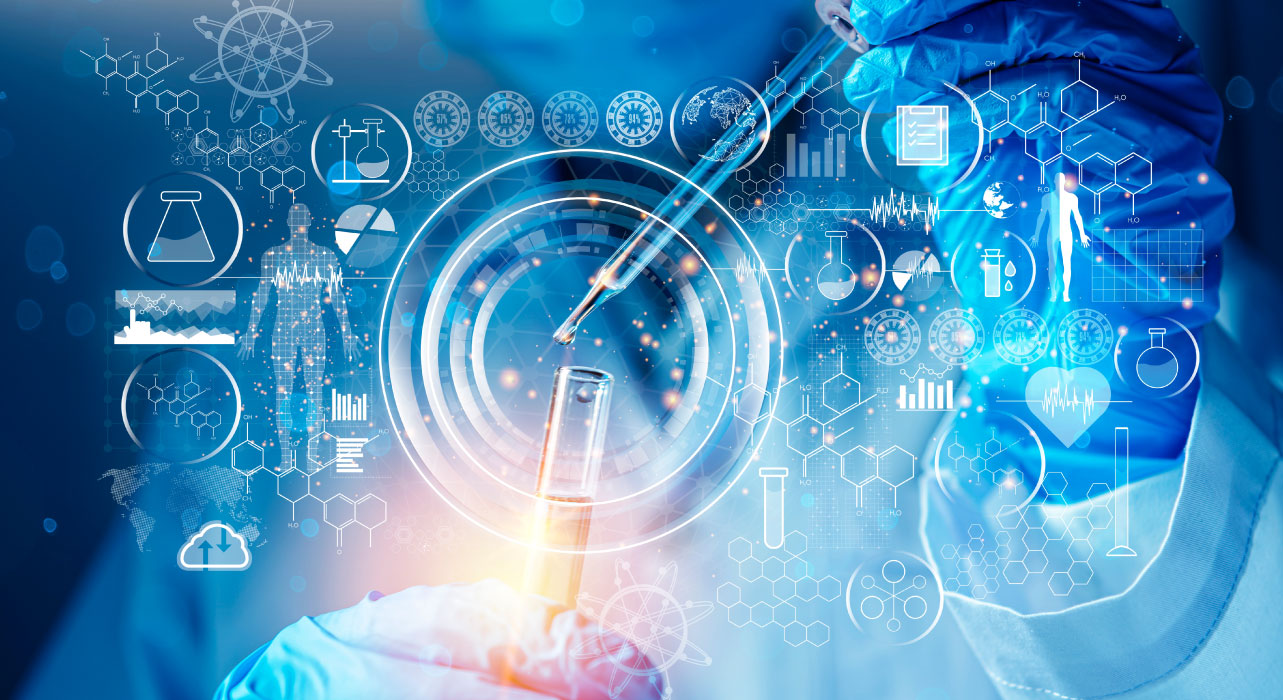 Mão a adicionar líquido a um tubo de ensaio, com gráficos e ícones digitais sobre saúde e farmacêutica em segundo plano.